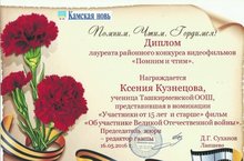 Ученица 11 класса МБОУ "СОШ пос. им. 25 Октября" Русалкина Алена стала лауреатом на XIII республиканских Кирилло - Мефодиевских юношеских научных чтениях в секции краеведение, проводимых Министерством образования и науки Республики Татарстан. Учитель Карпова Лидия Николаевна. 25.05.2016