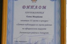 Призер конкурса "лучшая публикация их жизни района" учитель Песчано-Ковалинской школы Михайлова Елена Григорьевна полученное денежное вознаграждение перечислила на лечение 3-х летнего Ахмадиева Карима. Целью участия в конкурсе было выиграть деньги на оказание помощи. 29.04.2016