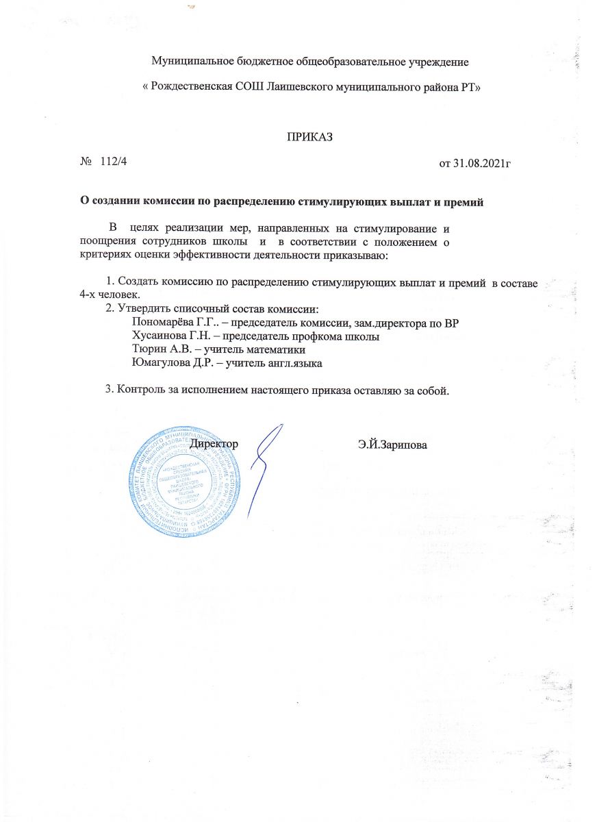 Приказ о создании комиссии по распределению стимулирующих выплат и премий