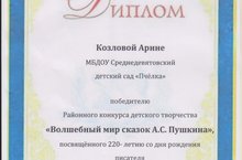 Поздравляем Козлову Арину с победой в районном конкурсе детского творчества "Волшебный мир сказок А.С. Пушкина", посвященного 220-летию со дня рождения писателя
