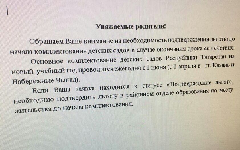 Уважаемые родители! Обращаем Ваше внимание на необходимость подтверждения льготы до начала комплектования детских садов в случае окончания срока её действия. Основное комплектование д/с РТ на новый учебный год проводится ежегодно с 1 июня. Если Ваша заявка находится в статусе "Подтверждение льгот" необходимо подтвердить льготу в районном отделе образования по месту жительства до начала комплектования 18.04.2019