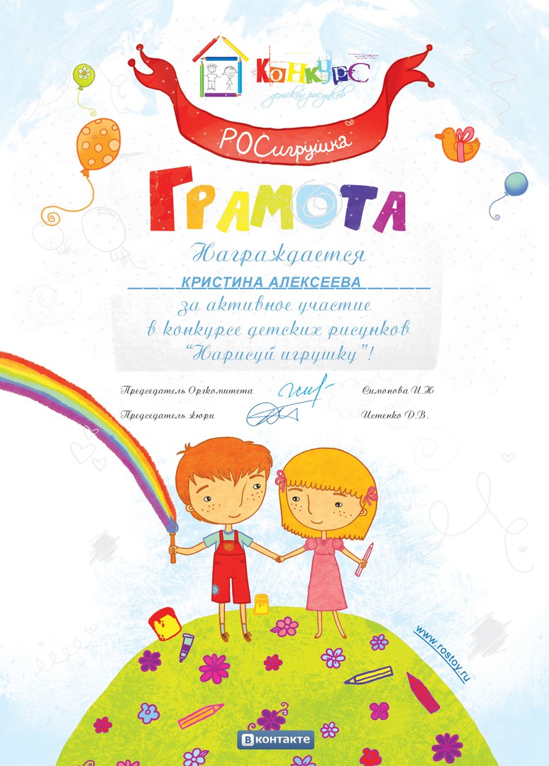 Алексеева Кристина награждена грамотой за активное участие в конкурсе детских рисунков "Нарисуй игрушку"!