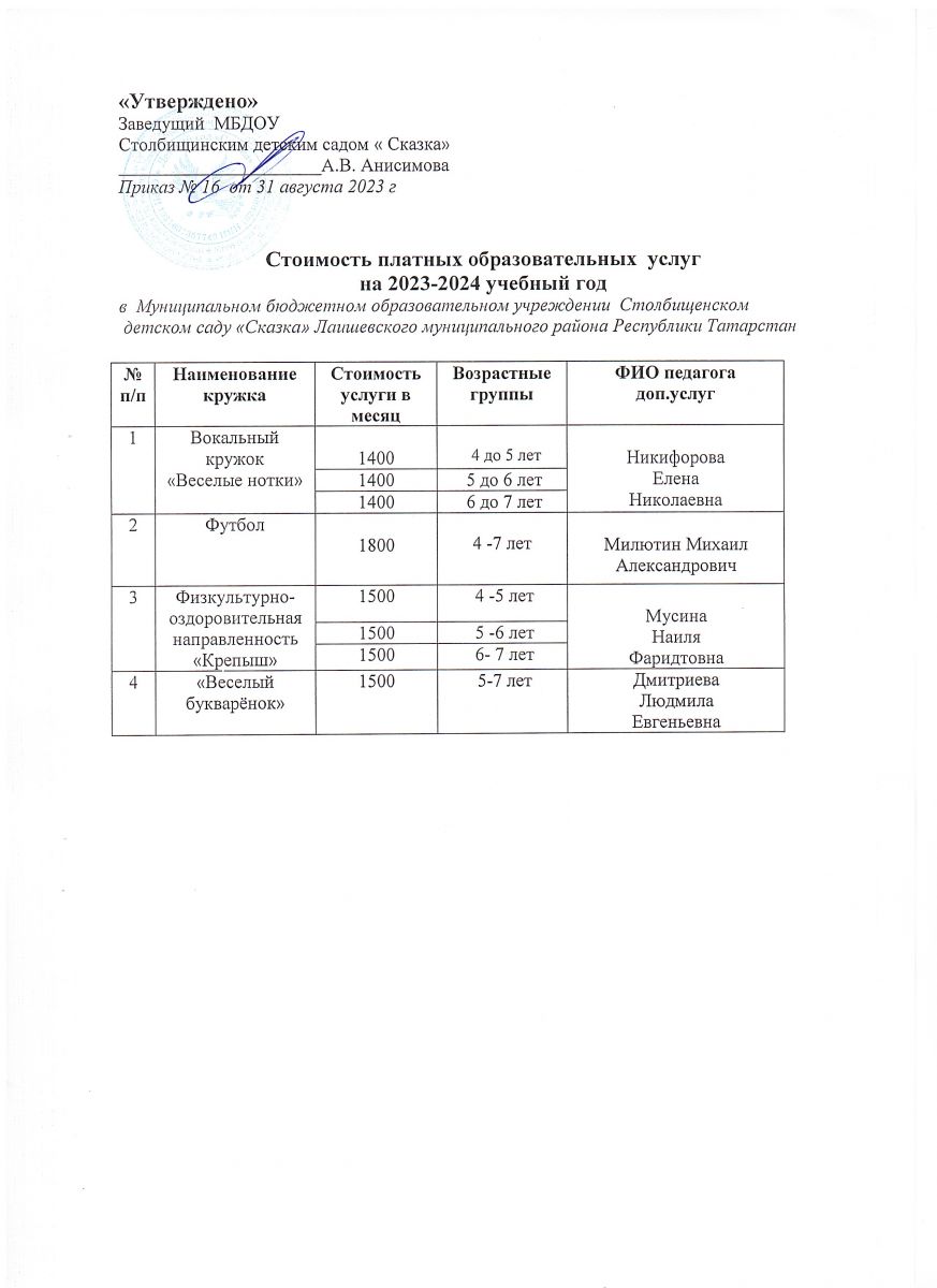 Стоимость дополнительных образовательных услуг 2023-2024 учебный год