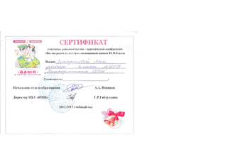 Обладателями сертификатов районной научно практической конференции «Все мы родом из детства», посвящённой памяти Ю.И. Коваля стали учащиеся 7 класса Шишкова Риана и 8 класса Смирнова Яна.