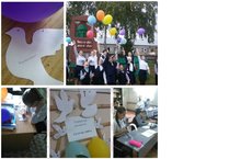 Существует традиция выпускать белых голубей, как символ мирных намерений. Очень красиво и эффектно смотрелись бумажные голуби, прикреплённые к цветным шарам, которых запустили сегодня учащиеся нашей школы под песню: «Летите, голуби, летите!» Завершилось мероприятие повязыванием ленточек на школьный символ скорби и печали, в память о погибших во всех войнах….