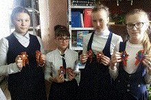 В преддверии Дня Победы ученицы 6-7 классов изготовили на кружке «Умейка», а 9 мая будут вручать учителям, родителям, а также всем пришедшим на митинг георгиевские ленточки. Георгиевская ленточка – это и символ, и дань памяти тем, кто пал, спасая мир от фашизма; это благодарность людям, отдавшим все для фронта; это символ уважения к ветеранам и гордости за Великую Победу!».