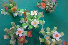 Готовые цветки приклеить к краешкам зеленых полосочек -травинок и расположить готовый букет на подходящей подставке.