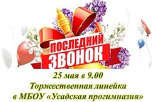 Приглашаем всех на торжественную линейку в честь Последнего звонка в МБОУ «Усадская прогимназия». Линейка состоится 25 мая в 9.00 во дворе нашей прогимназии. Вас ждёт прекрасный концерт и море эмоций. Приходим в форме прогимназии, не забываем с собой воду, головные уборы и только хорошее настроением Просим не опаздывать. Встретимся на праздник