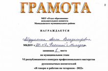 Подведены итоги муниципального этапа VI республиканского конкурса профессионального мастерства русскоязычных воспитателей "Я говорю и работаю на татарском -2022". Наш педагог Абдуллина Алла Владимировна заняла 1 место. Поздравляем, желаем дальнейших успехов!