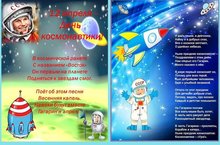 Космонавт — это герой! В космос нас зовет с тобой. Предлагает полетать, Новый мир всем открывать. Чтобы дети всей земли На Луну слетать смогли. Побывали на планетах, Познакомились с кометой. Устремлялись всегда ввысь, Лучше становилась жизнь. 10.04.2020