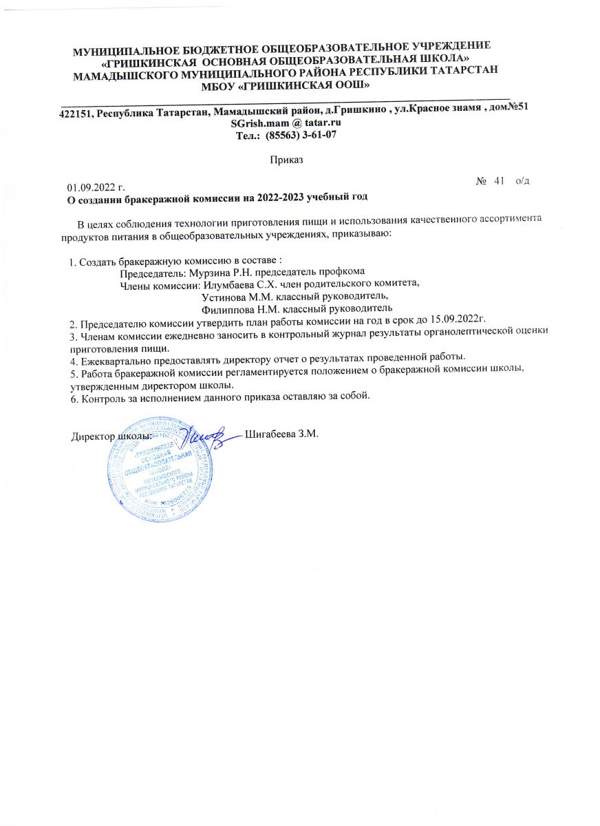 Приказ о создании бракеражной комиссии на 2022-2023 уч.год