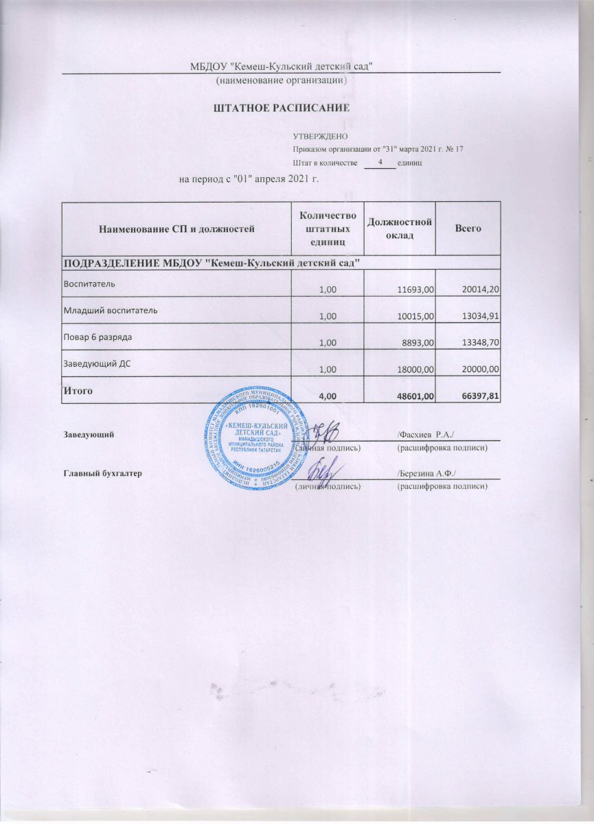 Штатное расписание МБДОУ Кемеш-Кульский ДС за 2021-2022 учебный год