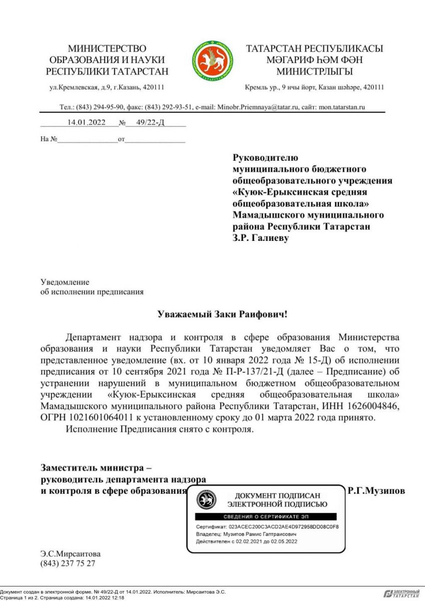 МБОУ «Куюк-Ерыксинская средняя общеобразовательная школа» Мамадышского муниципального района РТ; Татарстан Республикасы Мамадыш муниципаль районы муниципаль бюджет гомуми белем учреждениесе "Көек-Ерыкса урта гомуми белем мәктәбе"