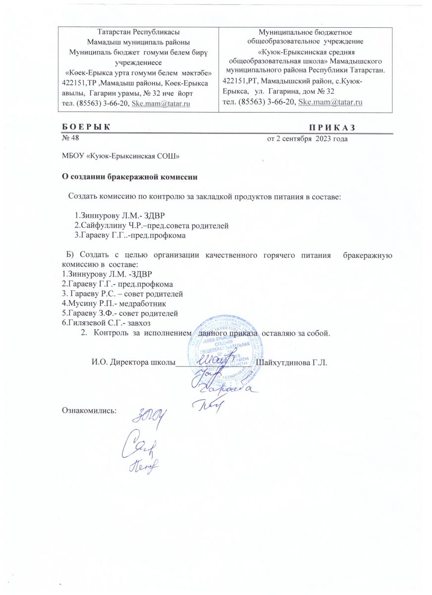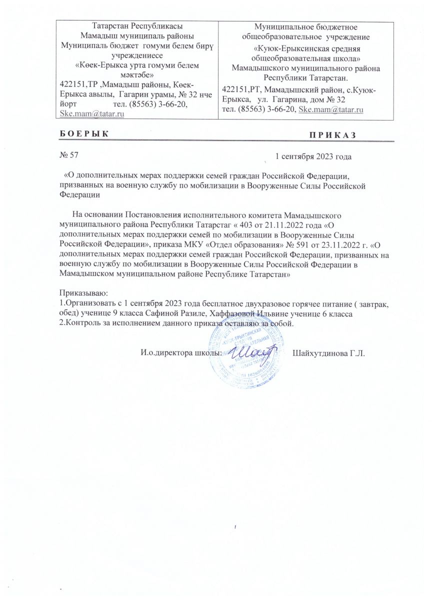 По любым вопросам организации питания детей вы можете обратиться к директору МБОУ "Куюк-Ерыксинская СОШ" Шайхутдиновой Гульнаре Латиповне