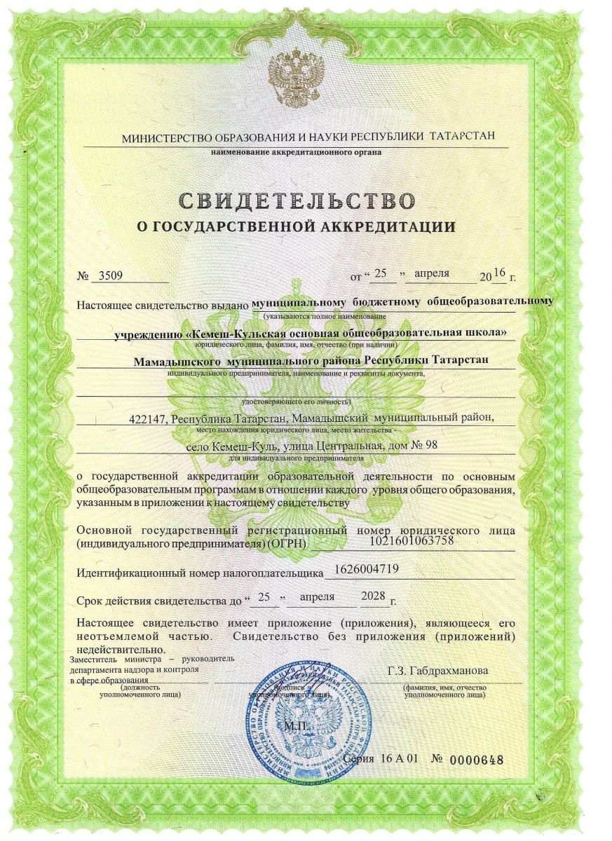 Муниципальное бюджетное общеобразовательное учреждение «Кемеш-Кульская основная общеобразовательная школа» Мамадышского муниципального района Республики Татарстан / Татарстан Республикасы Мамадыш муниципаль районы муниципаль бюджеттагы гомуми белем учреждениесе “Көмеш Күл төп гомуми белем мәктәбе”