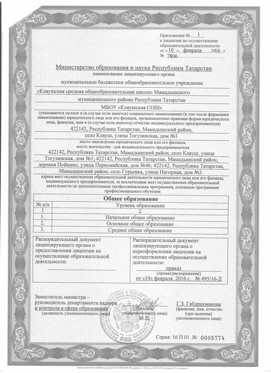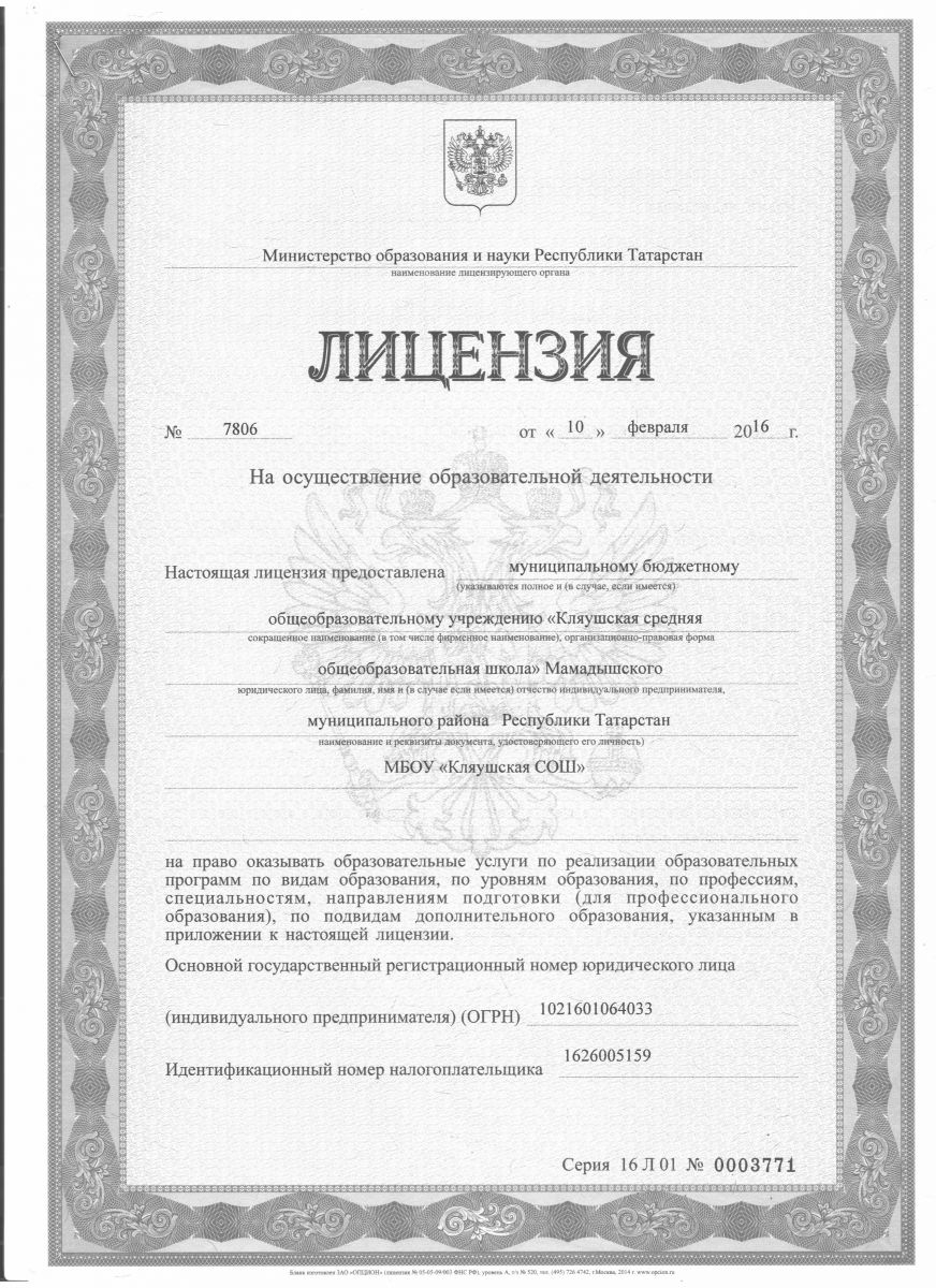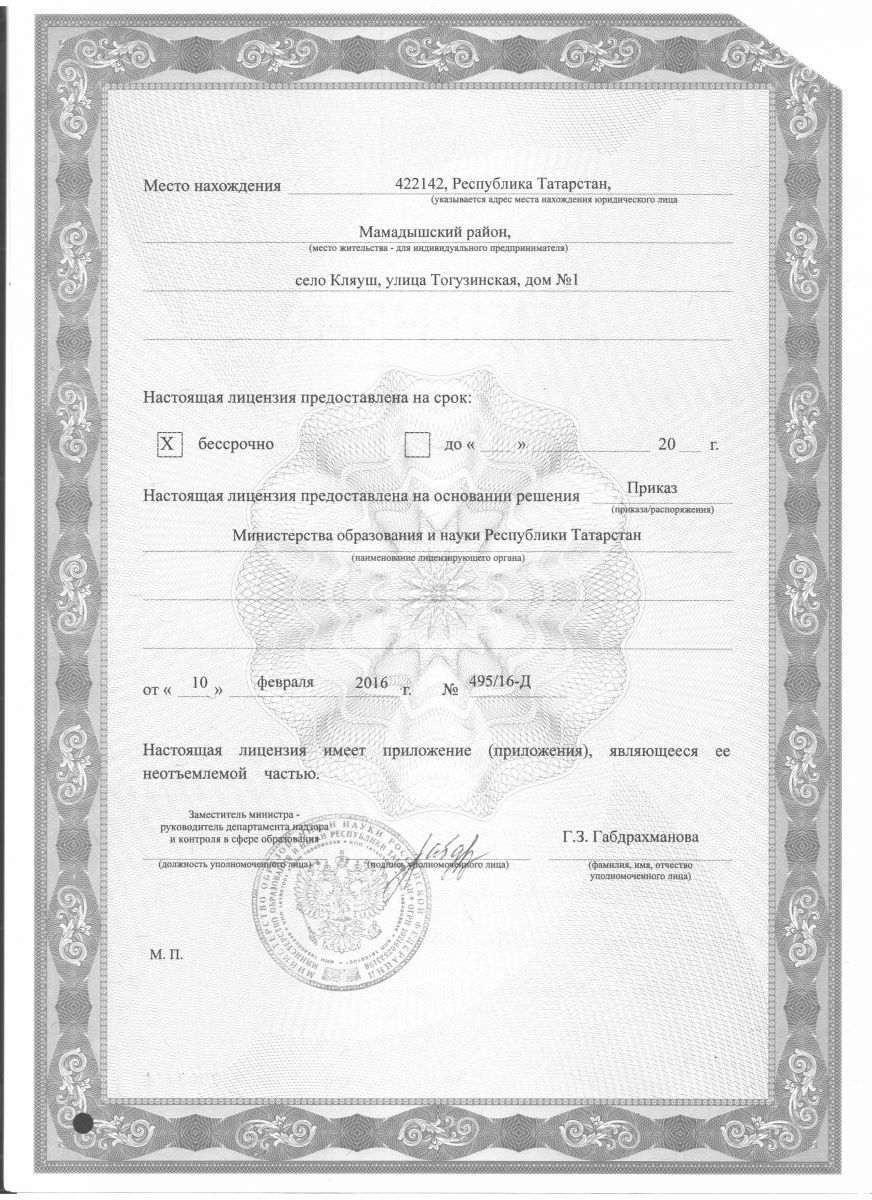 | Адрес: | 422142, Республика Татарстан, Мамадышский район, с. Кляуш, ул. Тогузинская, д. 1 |