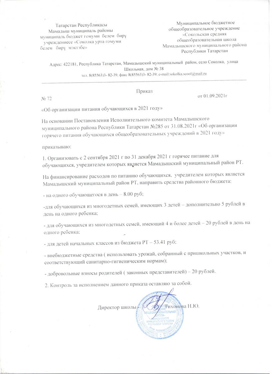 Приказ ОО № 362 от 01.09.2021 по питанию
