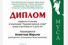 Ахметова Марьям стала лауреатом II степени в I Республиканском конкурсе "Красная ромашка (Кызыл ромашка)" посвящённый творчеству великого татарского поэта-героя Мусы Джалил