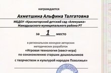 Педагог нашего детского сада Ахметшина Альфина Талгатовна участвовала в региональном конкурсе авторских методических разработок и заняла почётное 1 место. Поздравляем, желаем дальнейших побед!!!