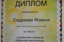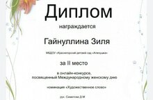 Воспитанница нашего детского сада Гайнуллина Зиля заняла 2 место в районном кокурсе посвященный Международному женскому дню, в номинации «Художественное слово». Поздравляем!!!
