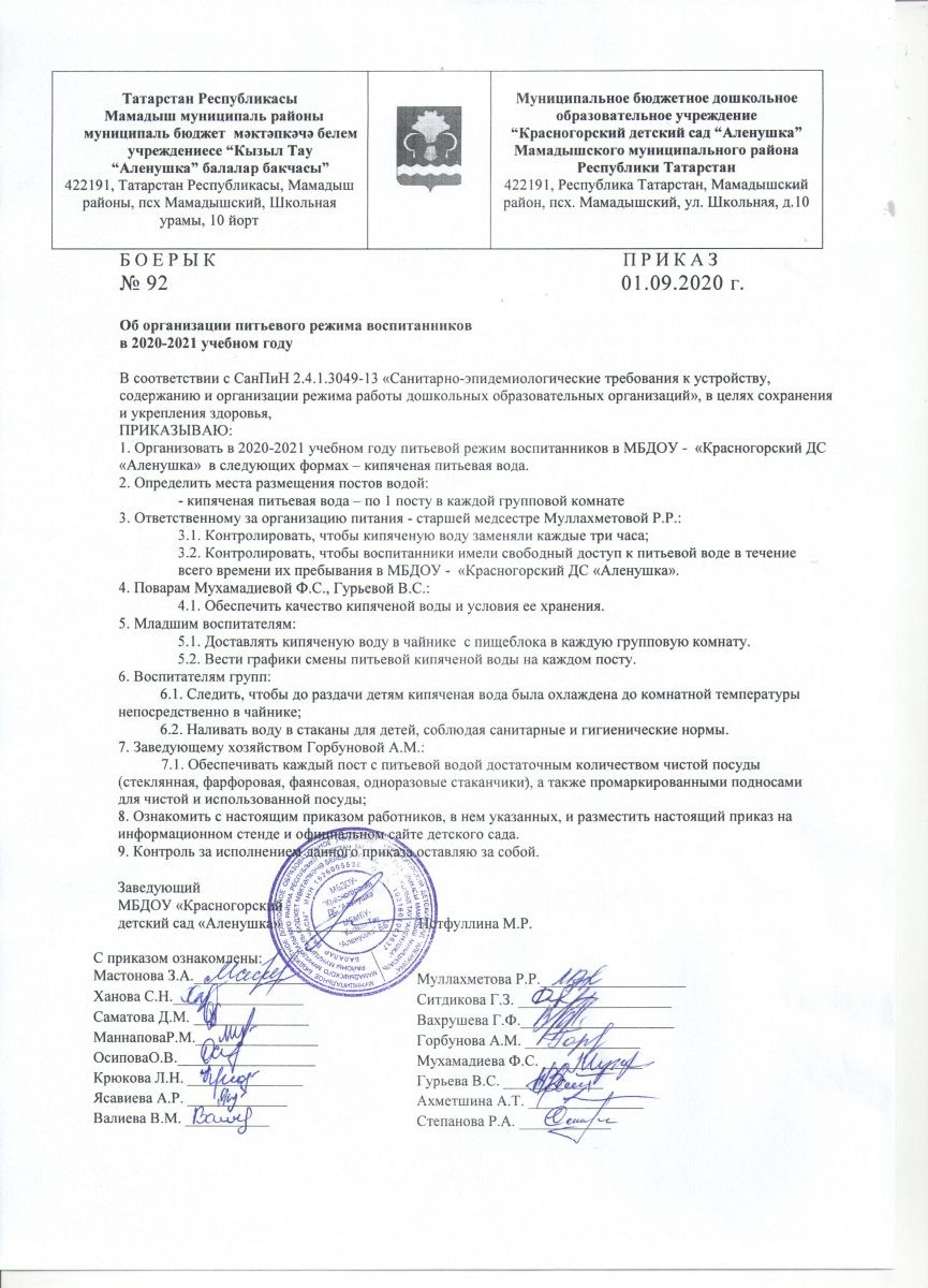 Приказ "Об организации питьевого режима воспитанников в 2020-2021 учебном году"