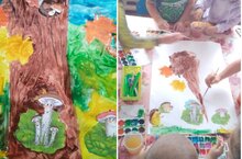 Балалар күмәк эшне яратып башкаралар. "Алтын көзнең алтын төсләре" картинасы.