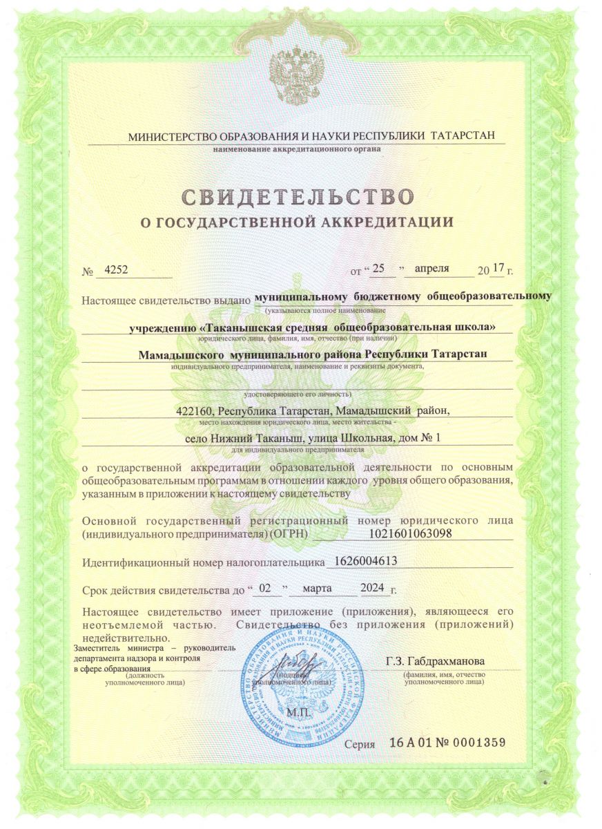 Муниципальное бюджетное общеобразовательное учреждение «Таканышская средняя общеобразовательная школа» Мамадышского муниципального района Республики Татарстан/ Татарстан Республикасы Мамадыш муниципаль районы муниципаль бюджет гомуми белем учреждениесе "Тәкәнеш урта гомуми белем мәктәбе"