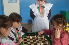 Во время перемен учащиеся активно проводят время, например играя в шашки.