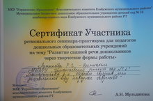 Участие воспитателя Латыповой Р.Г. в региональном семинаре-практикуме для педагогов дошкольных образовательных учреждений на тему "Развитие речи дошкольников через творческие формы работы". Выступала на тему- "Развитие связной речи дошкольников через народное творчество". 26.11.2015