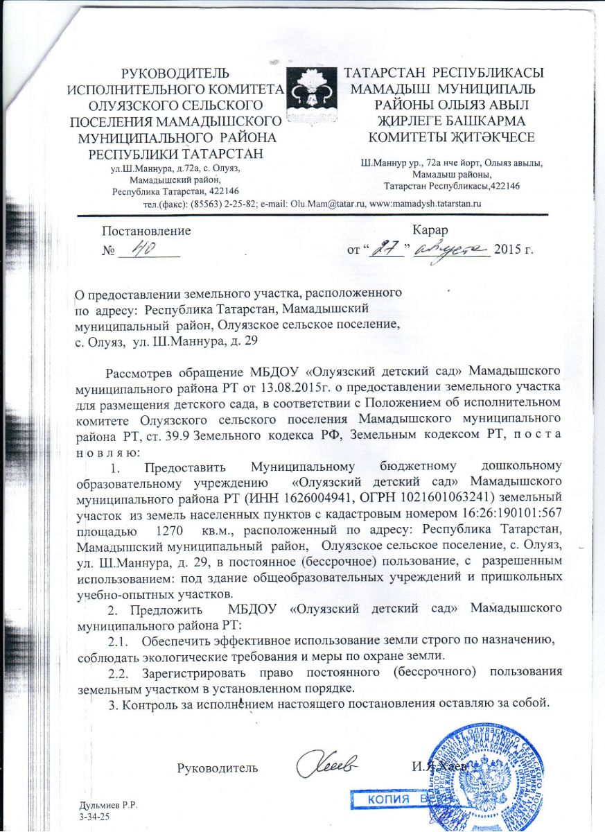 | Адрес: | 422146, Республика Татарстан, Мамадышский район, с. Олуяз, ул. Ш.Маннура, д. 29 |