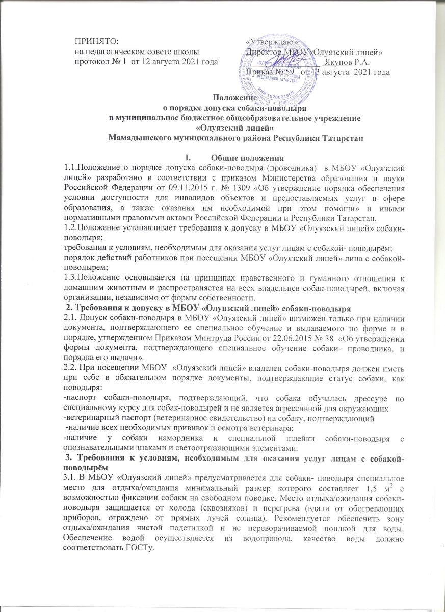 Доступ в здание МБОУ «Олуязский лицей» инвалидам и лицам с ограниченными возможностями здоровья обеспечен: вход оборудован пандусом и перилами. При необходимости инвалиду или лицу с ОВЗ будет предоставлено сопровождающее лицо.