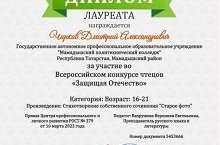 Во Всероссийском конкурсе чтецов «Защищая Отечество» со стихотворением собственного сочинения студентка колледжа Киселева Анна стала победителем, а Чирков Дмитрий - лауреатом. Поздравляем ребят и преподавателя русского языка и литературы Вахрушеву Веронику Евгеньевну!