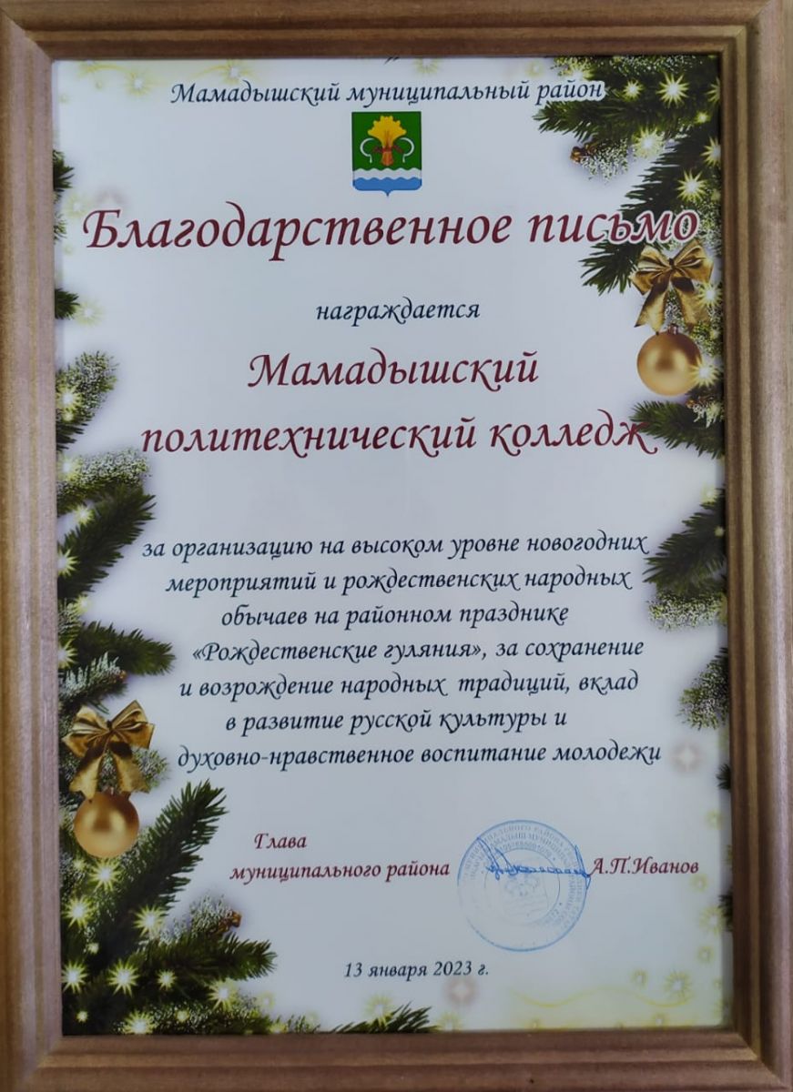 Глава муниципального района А.П. Иванов наградил ГАПОУ «Мамадышский политехнический колледж» благодарственным письмом за организацию на высоком уровне новогодних мероприятий и рождественских народных обычаев на районном празднике «Рождественские гуляния», за сохранение и возрождение народных традиций, вклад в развитие русской культуры и духовно-нравственное воспитание молодежи.