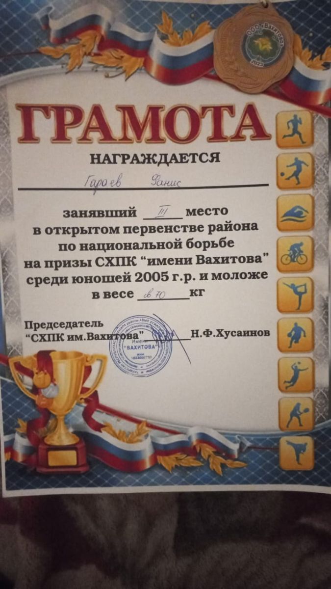 Грамотой награждается студент Мамадышского политехнического колледжа Гараев Фанис, занявший 3 место в открытом первенстве района по национальной борьбе на призы СХПК имени Вахитова среди юношей 2005 г.р. и моложе в весе свыше 70 кг. Поздравляем!