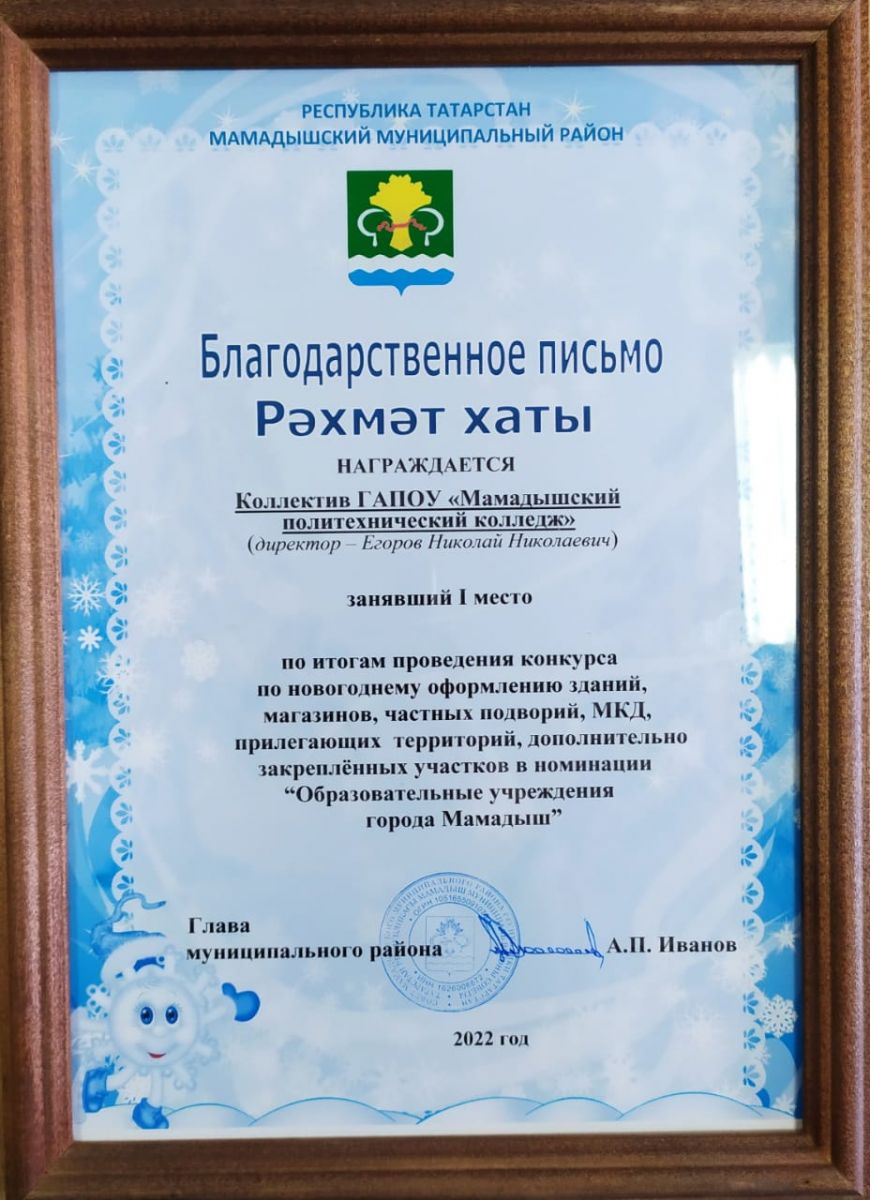 Глава муниципального района А.П. Иванов наградил благодарственным письмом коллектив ГАПОУ «Мамадышский политехнический колледж», занявший I место по итогам проведения конкурса по новогоднему оформлению зданий, магазинов, частных подворий, МКД, прилегающих территорий, дополнительно закрепленных участков в номинации «Образовательные учреждения города Мамадыш».