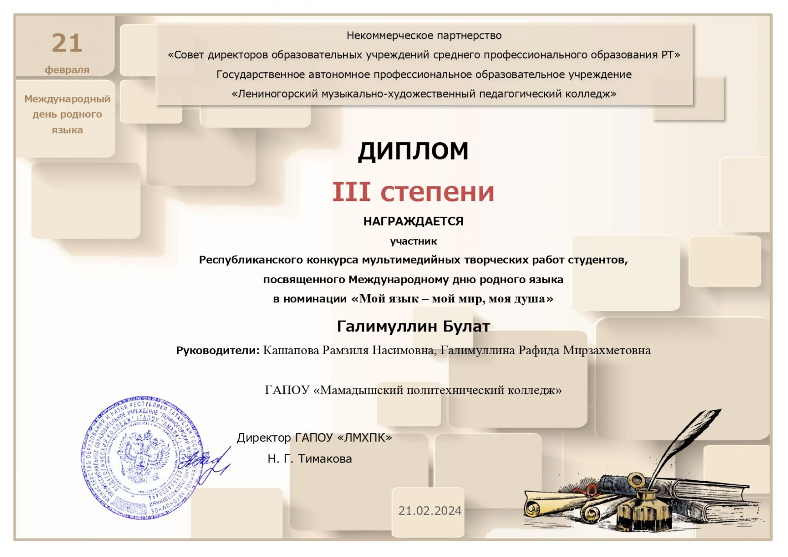 22.02.2024 г. на районном мероприятии студенты колледжа Рябков Дмитрий, Левин Андрей, Щербаков Никита, а также преподаватели Миннахметов А.И. и Крошечкин В.И. получили благодарственные письма за активное участие в оказании волонтерской помощи семьям участников специальной военной операции.