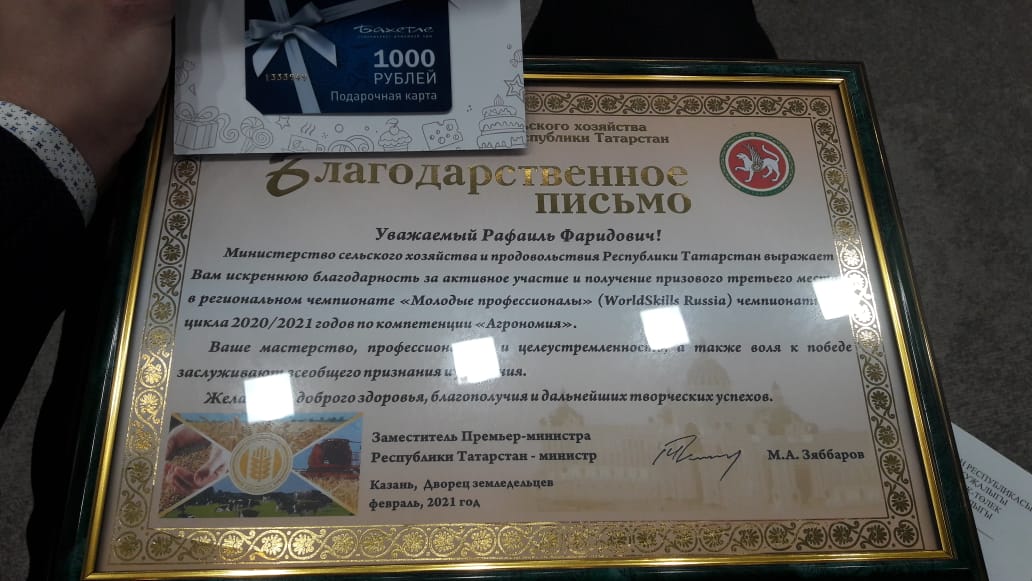 Наши победители и призеры Регионального чемпионата «Молодые профессионалы» (WorldSkiills Russia) чемпионатного цикла 2020/2021 годов по сельскохозяйственным компетенциям Галяутдинов Рафаэль, Галяутдинов Рамиль, Машуров Виктор, Сунгатов Райнур были награждены благодарственными письмами.