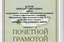 Директор ГАОУ СПО «Мамадышский профессиональный колледж №87» Н. Н. Егоров награжден Почетной Грамотой за большой вклад в развитие молодежного правоохранительного движения.