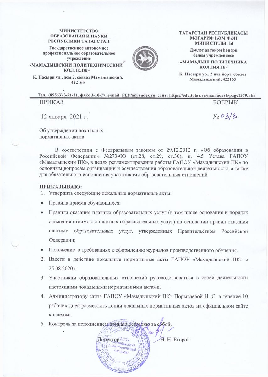 Приказ о зачислении обучающихся в ГАПОУ "Мамадышский ПК" от 23 августа 2021 г.