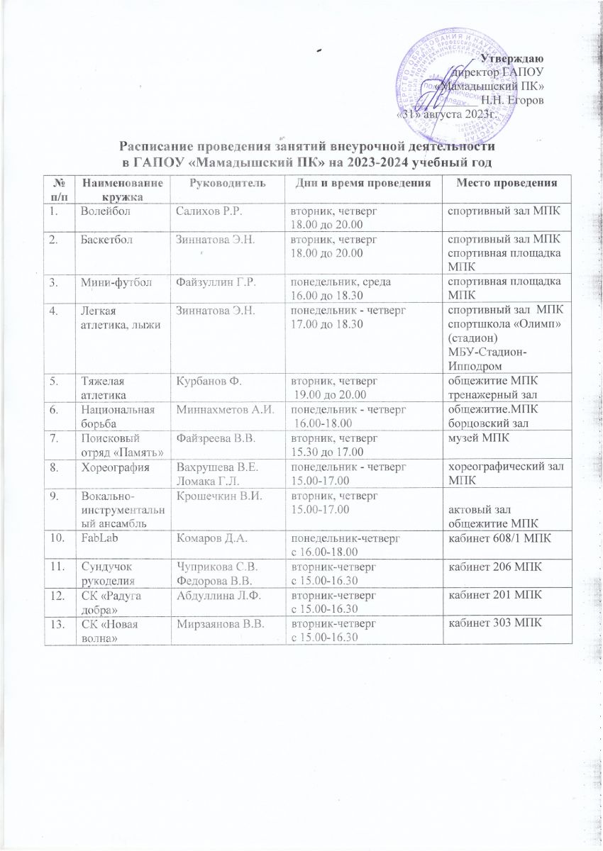 Расписание занятий внеурочной деятельности на 2023-2024 учебный год