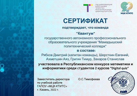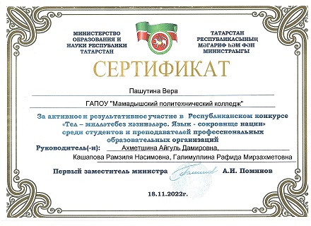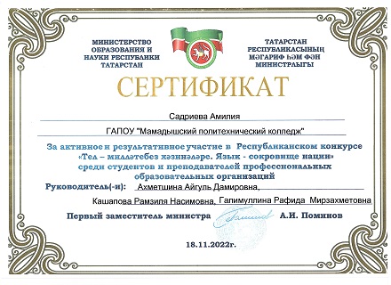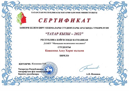 2022 елның 28 ноябрендә республика конкурсларында катнашучы студентлар сертификатлар белән бүләкләнде.