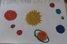 13 апреля в детском саду отметили День космонавтики, дети просмотрели презентации о первых космонавтах, о космосе. После просмотренных презентации, дети выполнили коллективную работу, они методом пластинографии нарисовали Солнечную систему.
