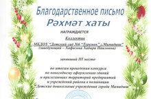30 декабря 2019 года в Ледовом дворце "Олимп" были подведены итоги конкурса по новогоднему оформлению зданий и прилегающих территорий предприятий и учреждений района в номинации "Детские дошкольные учреждения города Мамадыш". Наш коллектив занял по оформлению территории - 3 место.