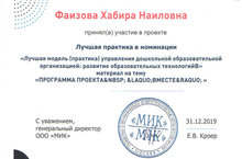 Наш детский сад принял участие в проекте Министерства просвещения Российской Федерации. Лучшая практика в номинации "Лучшая модель управления дошкольной образовательной организацией: развитие образовательных технологий". Наш детский сад удостоен сертификата участника проекта. Дальнейших успехов нашему коллективу.