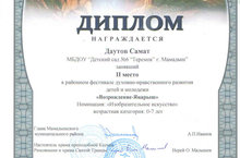 Наш воспитанник принял участие в районном фестивале духовно - нравственного развития детей и молодёжи "Возрождение - Янарыш" в номинации: "Изобразительное искусство" в возрастной категории от 0 до 7 лет. И занял - 2 место.