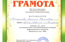 15 января 2020 года на базе МБДОУ «ДС № 4 «Экият» г. Мамадыш» прошёл муниципальный этап республиканского конкурса профессионального мастерства «Воспитатель года – 2020». Наша коллега - Герасимова Рамиля Фаиловна приняла участие в этом конкурсе и заняла почётное – 2 место. Мы желаем ей дальнейшей победы в зональном этапе.