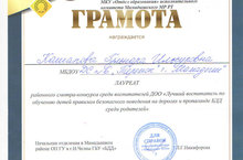 На базе МБДОУ "ДС № 8 "Нухрат" прошёл районный смотр - конкурс среди воспитателей ДОО "Лучший воспитатель по обучению детей правилам безопасного поведения на дорогах и пропаганде БДД среди родителей". На конкурс заявились - 11 педагогов. Наш педагог - Кашапова Гульнара Ильсуровна - приняла участие в этом конкурсе и стала ЛАУРЕАТОМ. Поздравляем Гульнару Ильсуровну и желаем ей дальнейших побед.