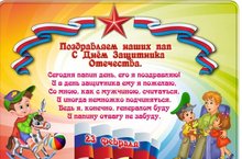 Праздник 23 февраля в детском саду- хороший повод для воспитания у дошкольников чувства патриотизма ,сопричастности к лучшим традициям своей Родины,формирования у детей гордости за славных защитников Отечества.Это праздник всех людей ,которые стоят на страже нашей страны.День нашей армии сегодня ,и ей уже не мало лет .Привет,Защиткикам народа!Росссийкой Армии привет!Под таким девизом 15 февраля 2021 года прошло музыкально-спортивное развлечение,посвященное Дню защитника Отечества.Воспитанники нашей "Радуги"рассказывали стихи про пап,играли в подвижные игры.("Тоннель","Веселые летчики") так же во время меропириятия прошли интерсные эстафеты ("Обойди мину","Полоса препятствий").В канун данного мероприятия дети сделали открытки папам своими руками. Спортивный задор захватил детей на столько ,что они не заметили ,как прошло время и нам уже пора прощаться.В группе царил смех, шум и веслье. Спасибо всем ,ребятки!!
