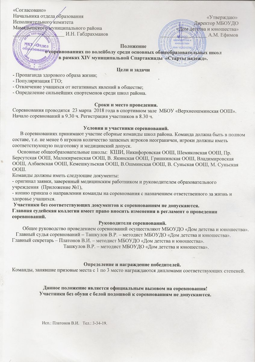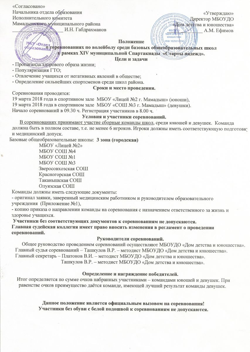 Положение о соревнованиях по волейболу среди сельских общеобразовательных школ учащихся 2001 г.р. и моложе в рамках XIV районной спартакиады учащихся "Старты надежд"