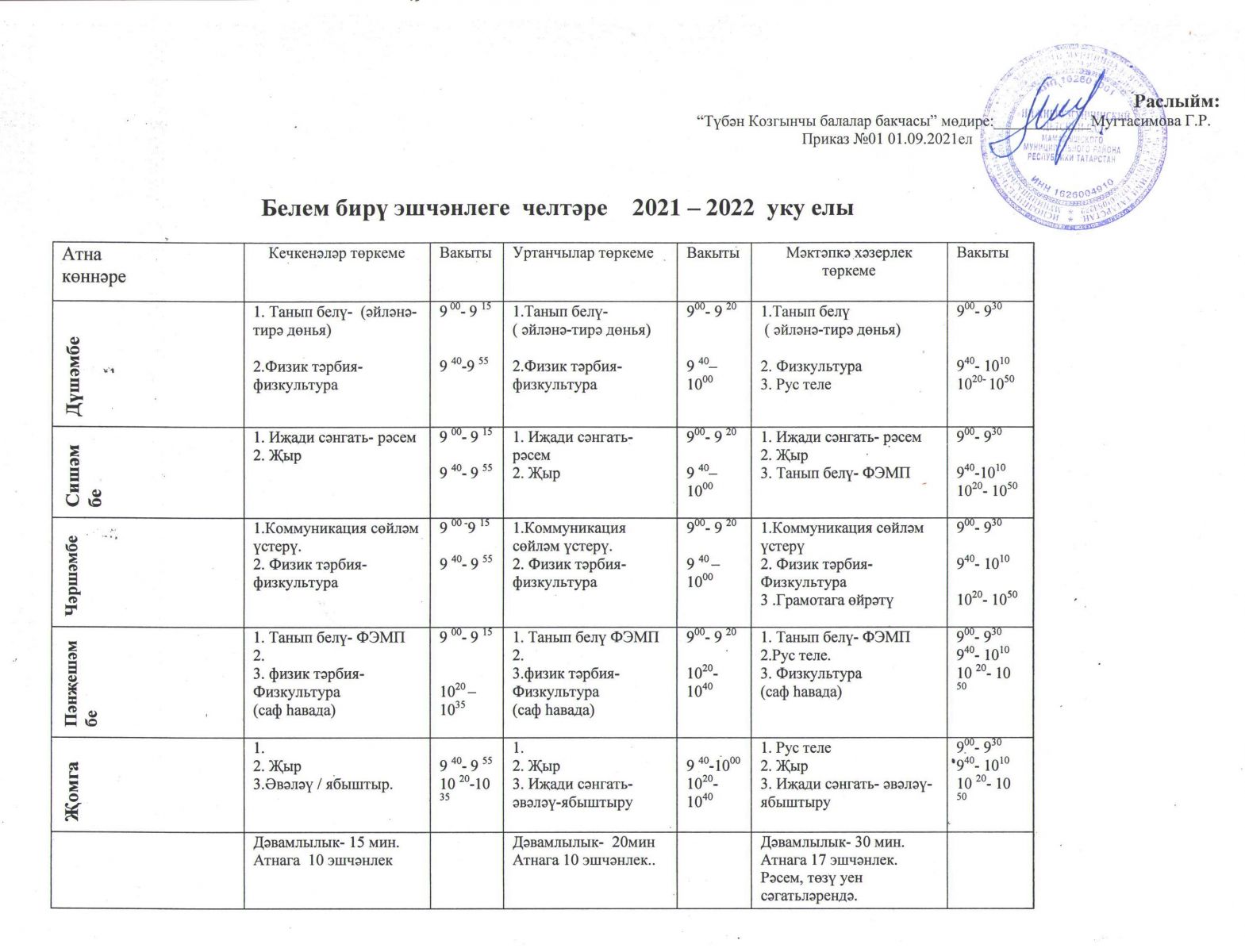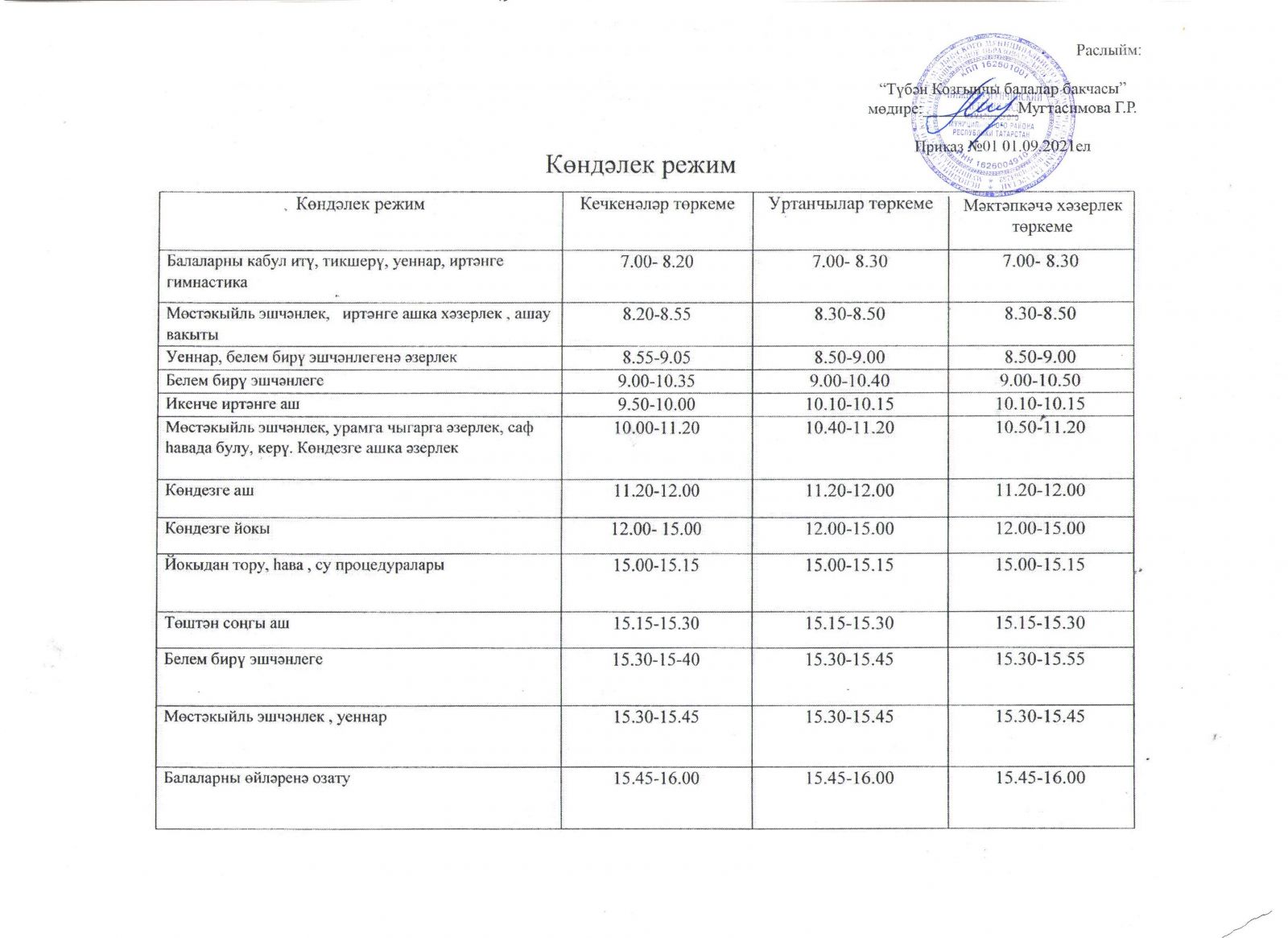 Режим работы детского сада: 5 - ти дневная рабочая неделя; длительность работы детского сада – 9 часов: с 7.00 до 16.00 часов ежедневно, кроме праздничных и выходных - субботы, воскресенья. Основной структурной единицей детского сада является группа детей дошкольного возраста. В группах общеразвивающей направленности предельная наполняемость устанавливается в зависимости от возраста детей и с потребностью мест.